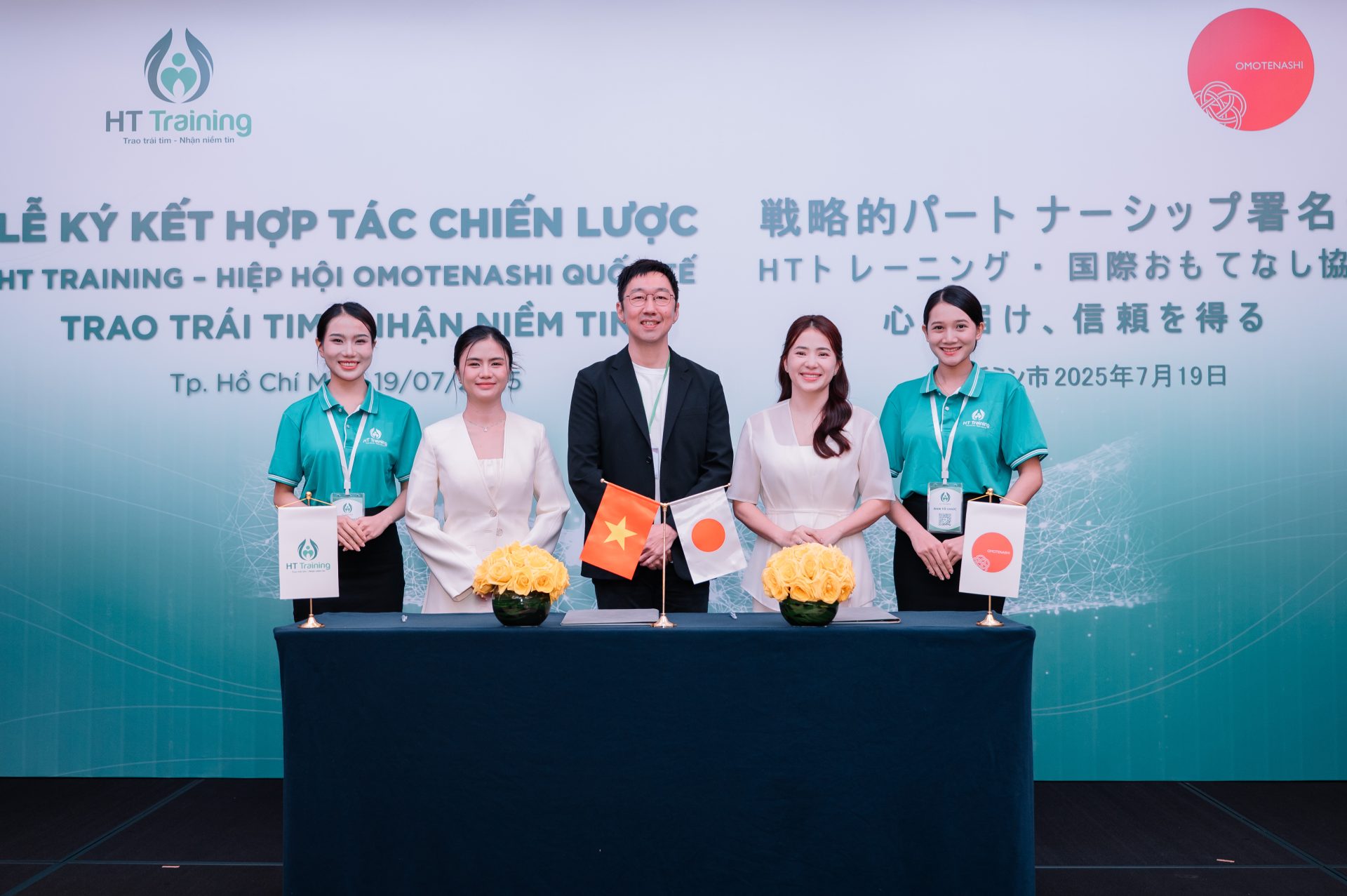 HT Training ký kết hợp tác chiến lược với Hiệp hội Omotenashi Quốc tế, đánh dấu bước khởi đầu quan trọng trong hành trình đưa đào tạo dịch vụ khách hành tận tâm theo triết lý Omotenashi đến gần hơn với doanh nghiệp Việt Nam. Với mong muốn đưa triết lý Omotenashi của Nhật có thể bén rễ, chuyển hóa để phù hợp với văn hóa đội ngũ nhân sự tại Việt Nam. Hợp tác này mang đến các giá trị then chốt cho doanh nghiệp Việt, từ chương trình đào tạo dịch vụ khách hàng tận tâm theo triết lý Omotenashi, đến chứng nhận do Hiệp Hội Omotenashi Quốc Tế cấp, khảo sát đánh giá chất lượng về năng lực dịch vụ khách hàng của đội ngũ nhân viên, trải nghiệm tại Nhật Bản...